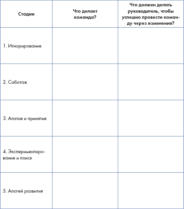 Используя таблицу, пройдите со своей командой через принятие нового и опишите свои действия как руководителя, чтобы привести команду к принятию изменений без потерь.