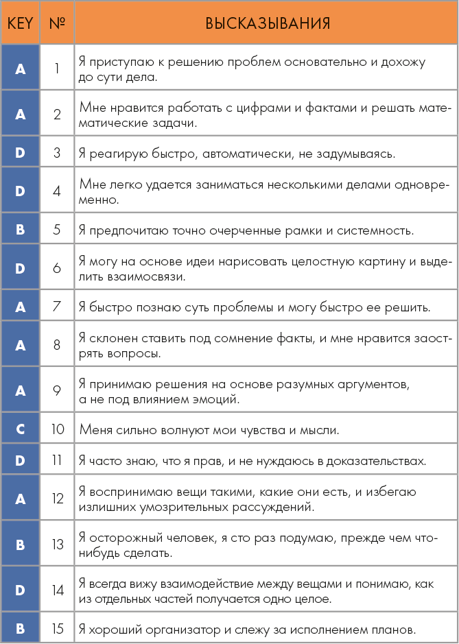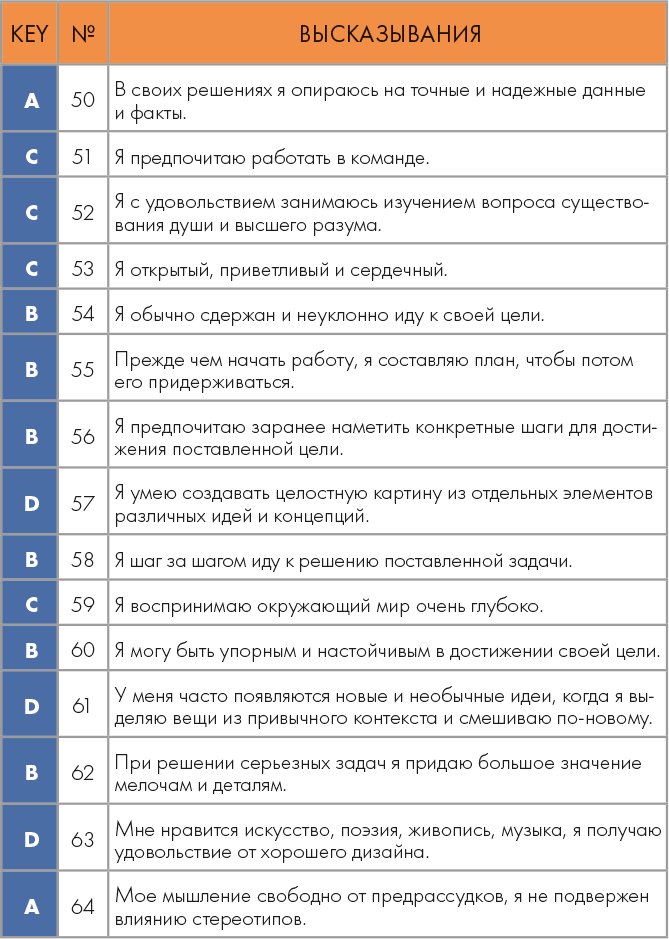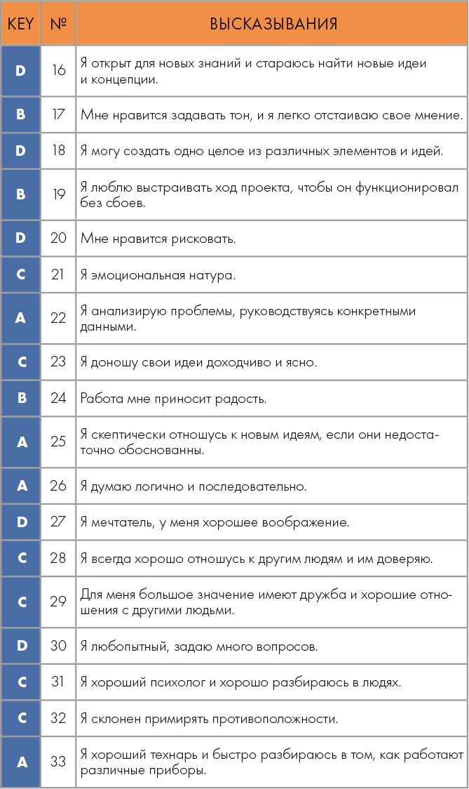 Ключ к тесту: если у вас больше всего А, то вы, скорее всего, аналитики, если В – организаторы, если С – психологи, если D – креаторы.