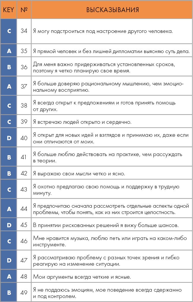 Затем посчитайте, сколько ответов A, B, C, D вы выделили. Ваш доминантный психотип тот, где больше баллов!