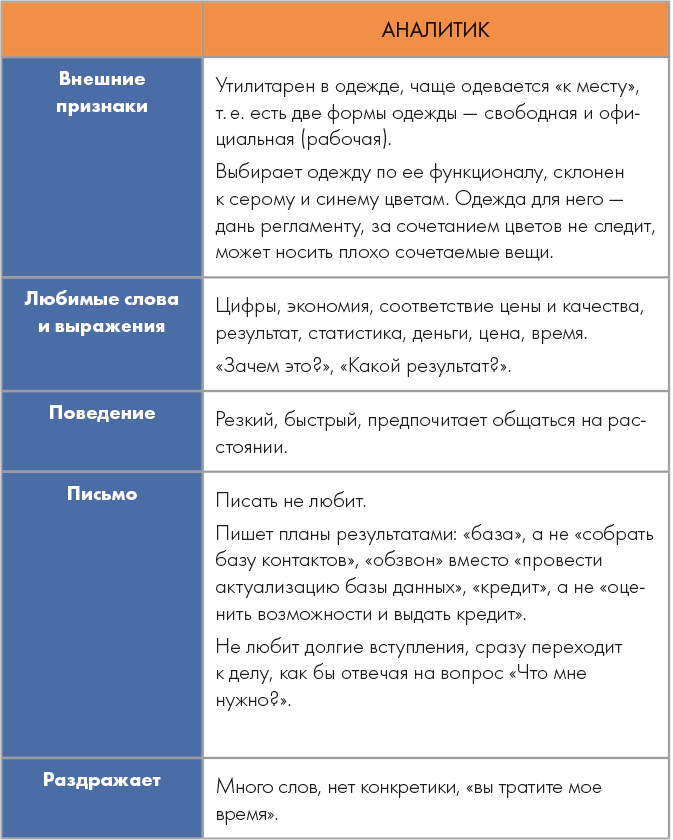 Хотите знать, какой квадрант преобладает в вашем мозге? Тогда пройдите тест HBDI самостоятельно. Существуют различные вариации тестов, суть которых сводится к выбору респондентом ответа, наиболее соответствующего его ощущениям. Например, предлагается оценить следующее утверждение: «Я выполняю работу внимательно и детализированно». Если респондент согласен, что это черта ему присуща в полной мере, то выбирает соответствующий ответ. Затем все ответы суммируются и высчитывается итоговый показатель, который интегрируется в итоговую оценку А, B, C или D, соответствующую одному из четырех квадрантов. Таким образом респондент узнает свой психотип: аналитик, организатор, психолог или креатор (cм. табл.). Если провести тестирование Херрманна в масштабах компании или хотя бы в рабочей команде, то руководитель будет иметь представление о психотипах своих подчиненных и выстраивать коммуникационную стратегию с каждым работником.