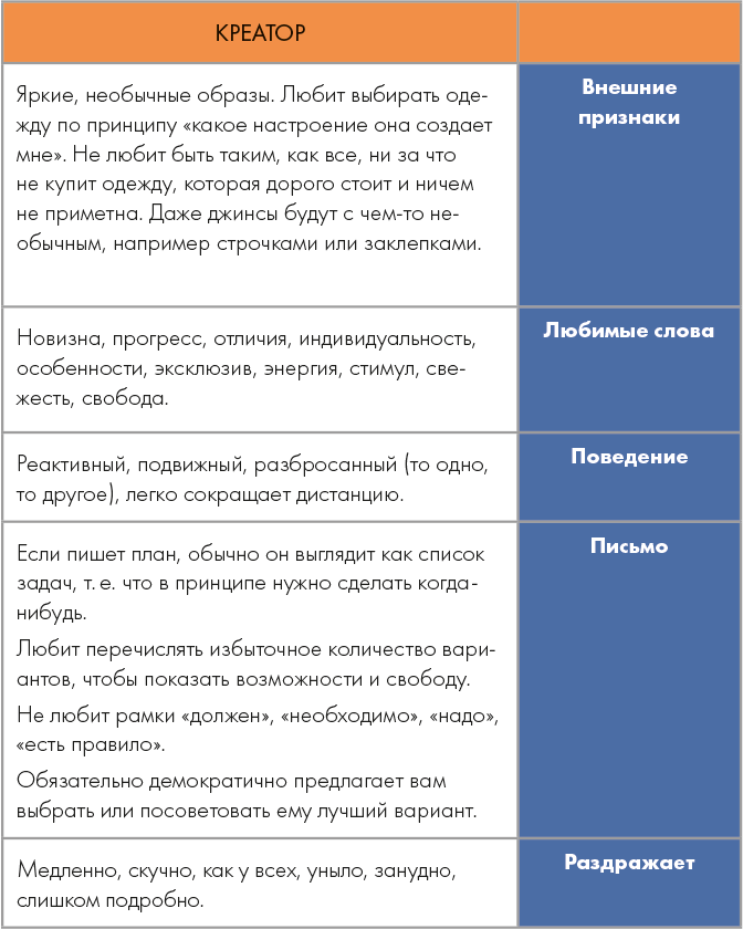Четвертый психотип – креатор. В лексиконе креатора на первых местах такие слова, как новизна, прогресс, отличие, индивидуальность, особенность, амбициозность, яркость, свобода, будущее, перспективы, преимущество, выгода. Вопросы, которые руководитель услышит от креаторов: «Что нового?» и «Чем отличается?». Когда руководитель заведет речь о внедрении электронного документооборота, креатор тут же спросит: «А что в этом нового? А чем эта система отличается от старой?» Креатору важно понимать, что новая система изменит компанию. Креатор любит передовое, любит сленг, любит вставлять в речь иностранные слова и выражения. Например, вместо фразы «получить обратную связь» будет говорить «получить фидбек»…