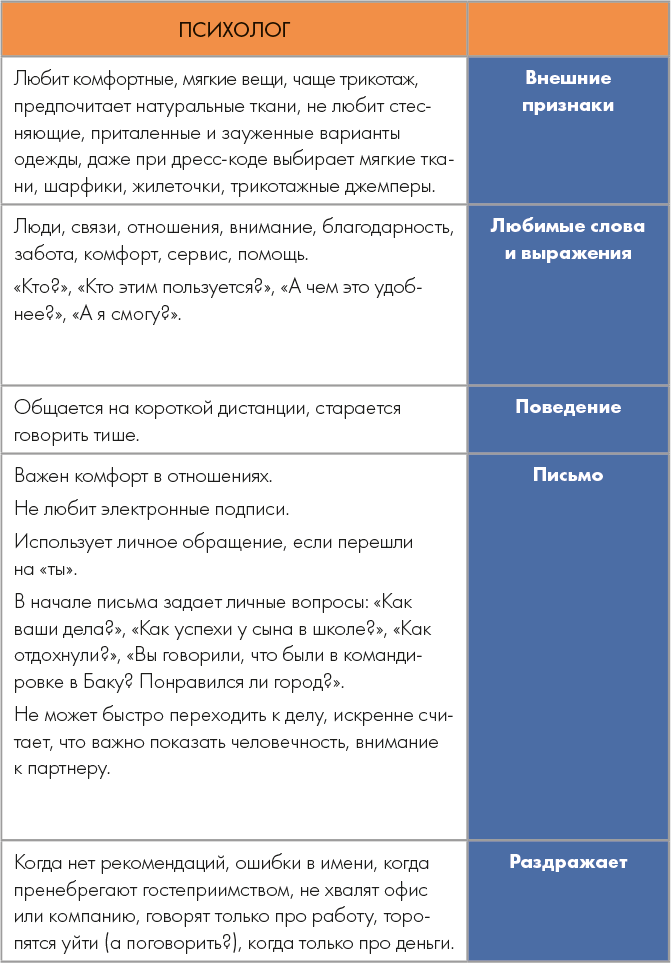 Третий психотип – психолог. Для таких людей важны слова: люди, связи, отношения, внимание, благодарность, забота, комфорт, сервис, помощь. Психолог любит советовать и советоваться. Для него важен комфорт в работе и короткая дистанция в общении, чтобы с ним говорили простым человеческим языком, не на «вы», не формально, а доверительно и дружелюбно. Два любимых вопроса психолога: «Кто?» и «С кем?». Например: «Кто придумал идею внедрять электронный документооборот? С кем я буду его внедрять? С кем можно посоветоваться по этому вопросу?» Если психологу что-то не нравится, то он сразу ищет виноватого и тональность его вопросов меняется: «Кто этот проект вообще придумал? Да кто этот электронный документооборот будет использовать? Разве кто-то будет работать с электронными документами?» и т. д. У психолога всегда найдется виноватый.