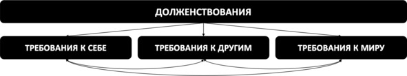 Три сферы долженствованийДолженствования проявляются в трёх сферах: требования к себе (то, что «я должен другим и себе») («Я должна всем нравиться», «Я не должен ошибаться», «Я должна быть хорошей», «Я не должен отказывать», «Я должен быть вежливым» и т.д.); требования к другим (то, что «другие должны мне») («Жена должна меня понимать», «Муж не должен так говорить», «Они не должны так себя вести», «Коллеги должны ценить меня», «Люди должны помогать мне» и т.п.); требования к миру (то, что «мир должен мне») («Мир должен быть справедлив», «В моей жизни не должно быть негативных событий», «Дождя сейчас не должно быть», «Молодые не должны умирать» и пр.) При этом важно заметить, что все три сферы долженствований являются, образно говоря, сообщающимися сосудами: если вы требуете от себя, то точно так же вы требуете от других (и наоборот), а если, например, ваш знакомый требует от других и мира, то у него есть и требования по отношению к самому себе (см. рис. 34).