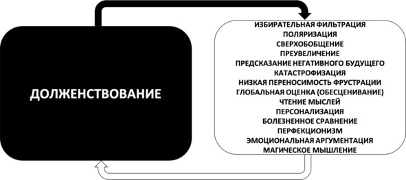 Взаимосвязь дисфункциональных убежденийВажно подчеркнуть, что такая же взаимосвязь прослеживается между долженствованиями и всеми остальными дисфункциональными убеждениями (когнитивными искажениями), которые были разобраны ранее. Более того, долженствование и сопровождающие его убеждения усиливают друг друга. Так, долженствование приводит к усилению, например, катастрофизации, а катастрофизация, в свою очередь, поддерживает долженствование. Такой порочный круг потворствует укоренению и разрастанию паутины дисфункциональных убеждений (см. рис. 37).