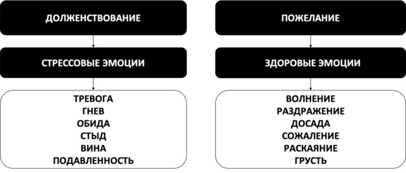 Связь долженствований и невротических эмоцийИтак, любая избыточная негативная эмоция является следствием долженствований и проистекающих из этого дисфункционального убеждения тех или иных когнитивных искажений. Таким образом, когда вы ощущаете сильную стрессовую эмоцию, вы, скорее всего, сознательно или неосознанно оперируете мыслями в стиле долженствований, которые, как вы уже знаете, являются доведёнными до крайности и абсолюта пожеланиями (см. рис. 39).