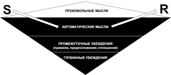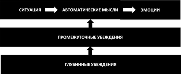 Фабрики по производству автоматических мыслейИтак, в одной и той же ситуации у разных людей будут возникать разные автоматические мысли, поскольку они произрастают из лежащих на уровень глубже промежуточных убеждений, которые были выработаны человеком в результате раннего (в том числе травматического) опыта взаимодействия со значимыми людьми и миром в целом. В отличие от автоматических мыслей, промежуточные убеждения менее осознаваемы, более устойчивы и распространяются на множество ситуаций, воздействуя на эмоции и поведение человека через порождаемые ими автоматические мысли. Промежуточные убеждения как клинические формы когнитивных искажений являются своего рода фабриками по производству автоматических мыслей. Как уже говорилось, автоматические мысли могут произрастать, например из убеждений катастрофизации («В этот раз я точно умру от тревоги»), низкой переносимости фрустрации («Я не выдержу визита к стоматологу»), сверхобобщения («У меня никогда ничего не получается») и многих других. Таким образом, промежуточные (и глубинные) убеждения являются источником автоматических мыслей, возникающих в конкретных ситуациях, а автоматические мысли, в свою очередь, являются отражением содержания промежуточных (и глубинных) убеждений.