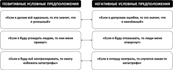 Позитивные и негативные условные предположенияПо мысли Джудит Бек, индивидуальные проявления дисфункциональных промежуточных убеждений удобнее всего описывать в виде условных предположений, выстроенных по формуле «если…, то…», а не в форме правил или отношений. При этом сами дисфункциональные условные предположения можно разделить на позитивные и негативные. Позитивные условные предположения отражают поведенческие стратегии, которые, по мнению человека, помогают ему добиваться положительных результатов и позволяют не сталкиваться с негативными глубинными убеждениями о себе, других и мире («Если я делаю всё идеально, то это значит, что я успешный»). Негативные условные предположения иллюстрируют стратегии поведения, которые, с точки зрения человека, ведут к отрицательным последствиям и угрожают столкновением с негативными глубинными убеждениями («Если я допускаю ошибки, то это значит, что я никчёмный») (см. рис. 43). При этом важно понимать, что как позитивные, так и негативные условные предположения являются проявлениями именно дисфункциональных промежуточных убеждений.