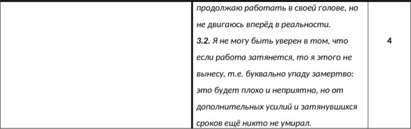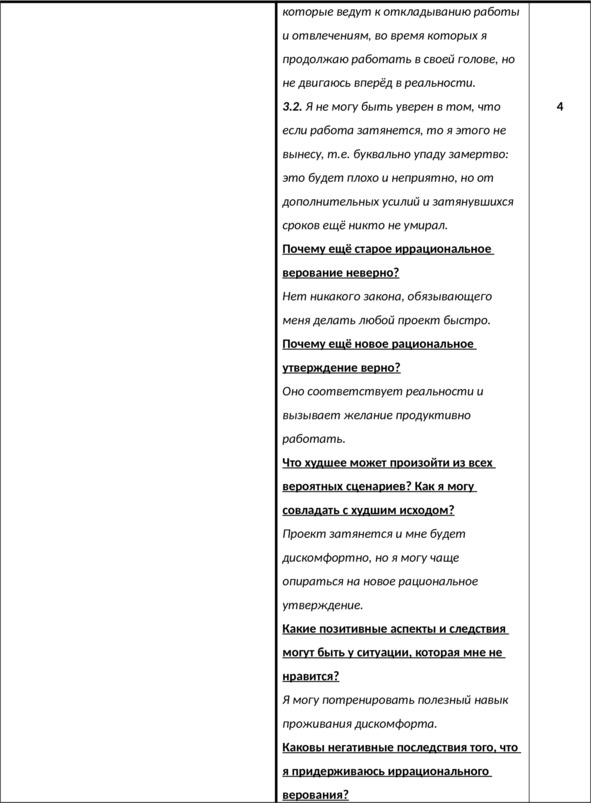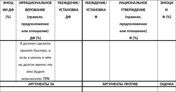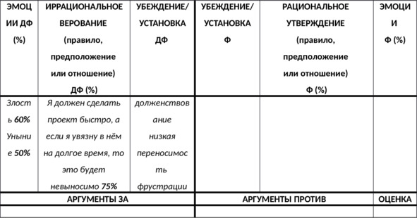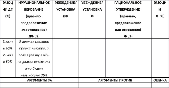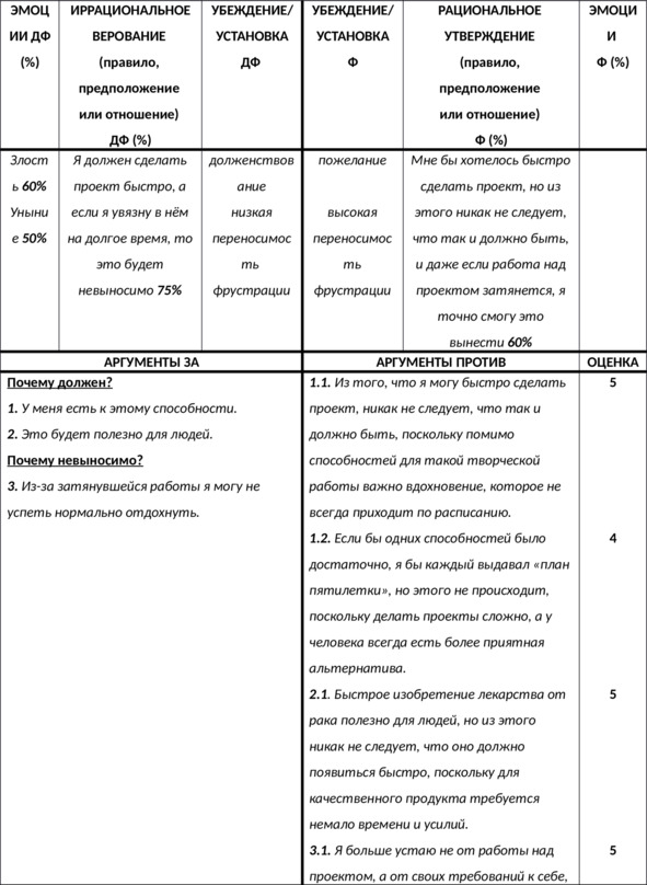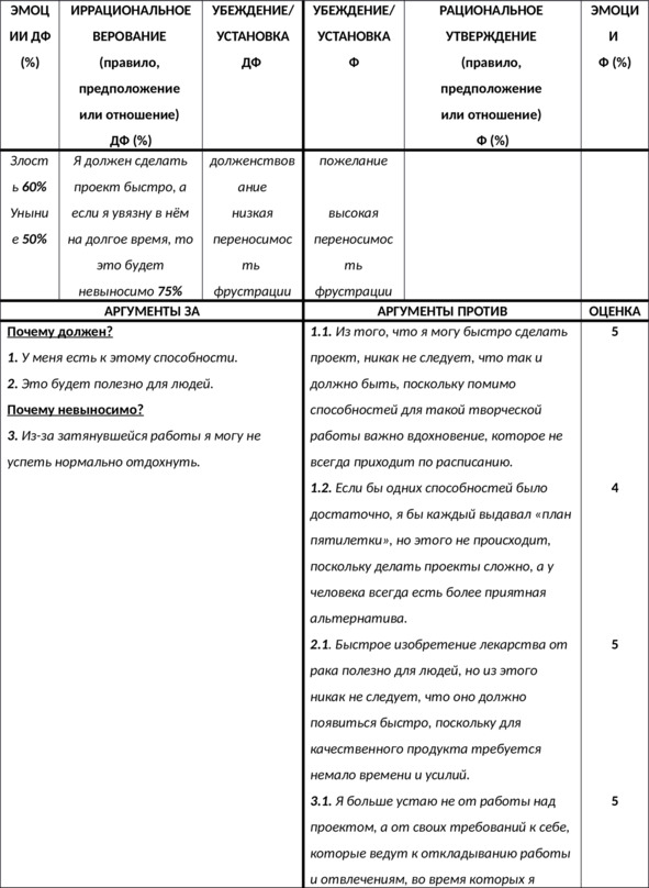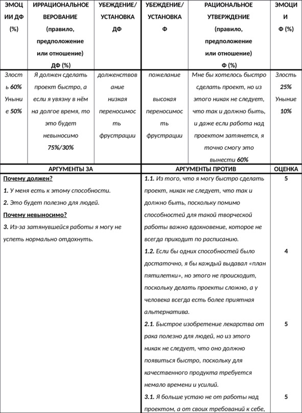 N.B. Важно выписать доказательства в пользу каждой из частей вашего иррационального верования – как в пользу содержащегося в нём требования (почему должен?), так и в пользу выводов из этого требования – например, катастрофизации, низкой переносимости фрустрации, глобальной оценки и других – в зависимости от формулировки верования (почему это ужасно? почему это невыносимо? почему в этом случае я неудачник? и т.д.).