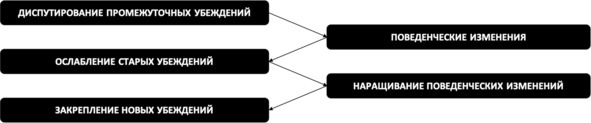 Взаимовлияние мышления и поведенияКогнитивная реструктуризация условных предположений (иными словами, диспутирование иррациональных верований промежуточного уровня) приводит к изменению поведения. Без предварительной когнитивной работы с правилами и условными предположениями большинству людей достаточно сложно изменить свой привычный образ действий. Однако в некоторых случаях даже весьма незначительной когнитивной реструктуризации промежуточных структур оказывается достаточно для того, чтобы человек начал менять своё поведение, которое, в свою очередь, будет способствовать изменению промежуточных конструкций – правил, условных предположений и отношений. Итак, поведенческие изменения, как правило, являются следствием когнитивных интервенций, но в то же время закрепляют результаты когнитивной работы – и так далее (см. рис. 46).