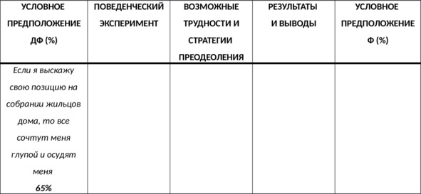 Действие 2. Разработайте поведенческий эксперимент, который вы хотите провести для проверки дисфункционального условного предположения, сформулируйте возможные трудности, которые могут возникнуть в ходе реализации этого поведенческого эксперимента, а также разработайте стратегии их преодоления (см. таб. 57).