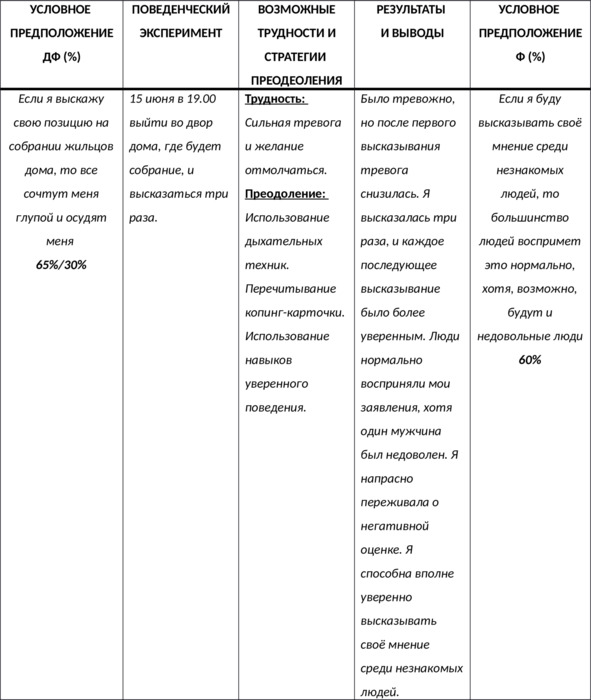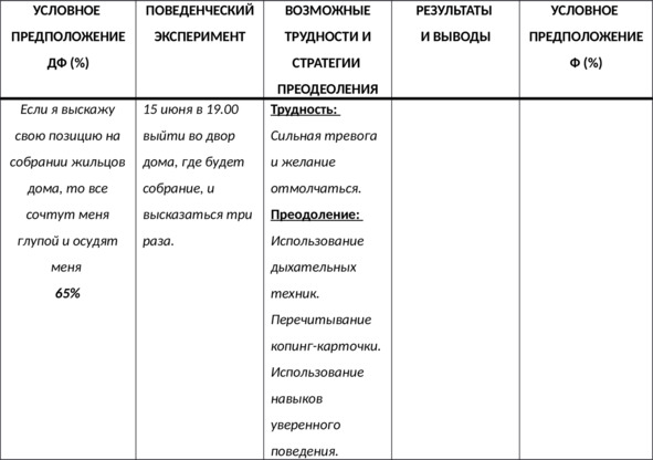 Структура дневника поведенческих экспериментов УЭРУОбратите внимание на то, что, как и в случае с когнитивной реструктуризацией условных предположений, их поведенческое изменение будет эффективно только в том случае, если они сформулированы конкретно – поведенческая проверка абстрактных условных предположений не приведёт к желаемому результату. Говоря иначе, просто невозможно эффективно проверить условное предположение «Если я буду говорить спонтанно, то точно скажу какую-то глупость, и все меня осудят» – лучше переформулировать его в более конкретное, например: «Если я выскажу свою позицию на собрании жильцов дома, то все сочтут меня глупой и осудят меня». Для того чтобы разрабатывать и реализовывать поведенческие эксперименты, вы можете использовать дневник поведенческих экспериментов УЭРУ (© Качай И. С., Федоренко П. А., 2021). Данный дневник имеет следующую структуру: