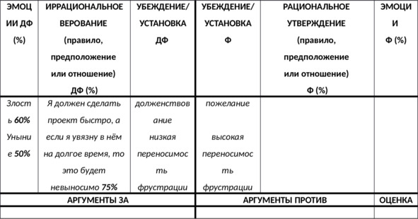 [Закрыть] то для оспаривания иррациональных верований промежуточного уровня (правил, условных предположений и отношений) используется схожий, но ещё более детализированный дневник диспута ЭВУ-УРЭ с аргументами4747