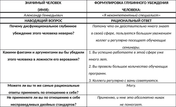 Специфика поведенческой модификации глубинных убежденийВажным этапом поведенческих экспериментов также является последующая когнитивная работа – сопоставление старых и новых глубинных убеждений с реальным положением дел и анализ того, какое из убеждений больше соответствует действительности. Такой активный поход позволит получать ценный опыт, противоречащий закостенелым стереотипам мышления, что поможет ослабить и расшатать старые и укрепить и принять новые функциональные глубинные убеждения, которые будут способствовать решению накопившихся проблем и значительному улучшению качества жизни. Как уже замечалось, получение нового опыта и его последующее осмысление позволят вам агглютинировать новые личностные смыслы и формировать новую матрицу индивидуальных значений, что будет приводить к тому, что вы начнёте чаще находиться в контакте с реальностью и перестанете слепо верить своим негативным и искажённым автоматическим мыслям и деструктивным убеждениям – как промежуточным, так и глубинным.