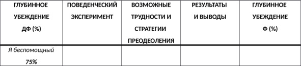 Действие 1. Выпишите конкретное дисфункциональное глубинное убеждение, которое вы хотите ослабить в результате проведения поведенческого эксперимента, и определите степень веры в это ядерное верование в процентах на данный момент времени (см. таб. 78).