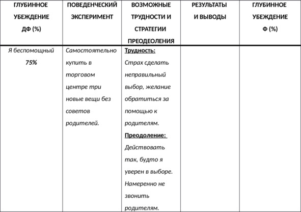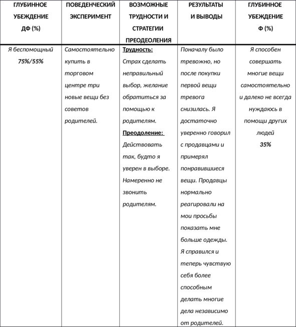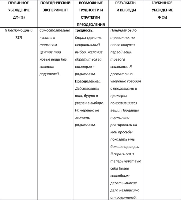 Техника «действуй как будто»Проводите как минимум один поведенческий эксперимент в день, чтобы действительно ослабить прежние и укрепить новые глубинные убеждения (можете заносить результаты экспериментов в таблицу доказательств глубинных убеждений (для текущего опыта)). Начинайте с выполнения простых поведенческих экспериментов и постепенно повышайте их сложность, а также осуществляйте их спонтанно, ища дискомфортные ситуации для укрепления новых и ослабления старых глубинных убеждений. Во время проведения поведенческих экспериментов и в жизни в целом действуйте так, будто вы полностью верите в своё новое функциональное глубинное убеждение: как бы вы вели себя, если бы верили в своё новое глубинное убеждение? что бы вы делали реже? как бы вы посоветовали поступать своему ребёнку? что бы подсказали лучшему другу? Подумайте о том, в каких ситуациях и с помощью каких действий вы могли бы испытать своё новое функциональное глубинное убеждение на этой неделе, ведя себя так, словно вы действительно уверены в его истинности и полезности. Чем чаще вы действуете в соответствии со своим новым убеждением, тем сильнее вы его укрепляете, поэтому, как замечают К. Добсон и Д. Добсон, вы можете руководствоваться принципом «делай как можешь, пока не почувствуешь, что действительно можешь».