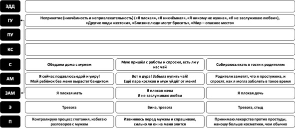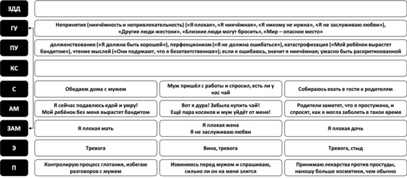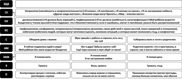 Расшифровка условных обозначений (сверху вниз): ЗДД – значимые данные детства; ГУ – глубинные убеждения; ПУ – промежуточные убеждения; КС – компенсаторные стратегии; С – ситуация (событие); АМ – автоматические мысли (ключевые); ЗАМ – значение автоматических мыслей; Э – эмоции; П – поведение.