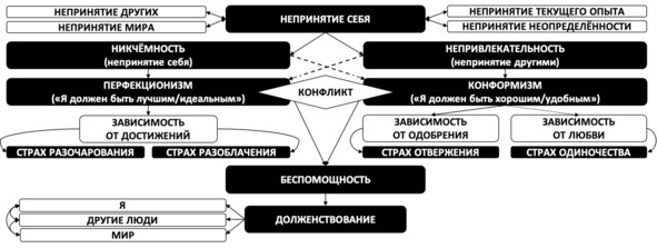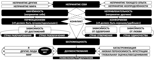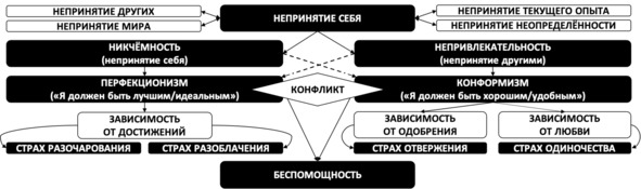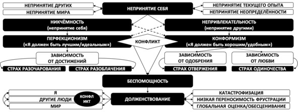 Продолжая прокачивать перфекционизм и/или конформизм и требуя от себя быть лучшим (идеальным) и/или хорошим (удобным), человек в любом случае будет чувствовать себя беспомощным, ведь эти компенсаторные стратегии раз за разом не будут срабатывать. Однако беспомощность, выделенная Аароном Беком как ещё одно глубинное убеждение наряду с непринятием (разделённым Джудит Бек на никчёмность и непривлекательность), в ряде случаев является выученной (по Мартину Селигману) и выступает не глубинным, а, скорее, промежуточным убеждением, как и «королева убеждений» – долженствование. Иными словами, сколько бы человек ни бился своими компенсаторными стратегиями за принятие и сколько бы он ни требовал от себя – достижений, а от других – одобрения и любви, он будет беспомощен такими способами доказать как себе, так и другим, что он полноценный («кчёмный» и/или привлекательный) (см. рис. 93).