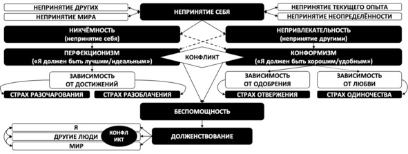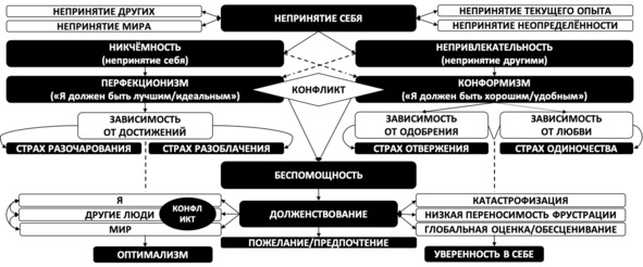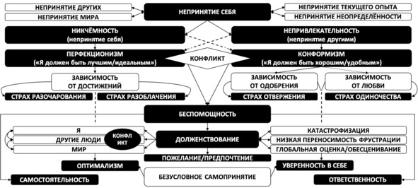 Требования к себе, другим и мируСами требования (долженствования), раскрывающиеся в трёх взаимосвязанных сферах (требования к себе, требования другим и требования миру), являются промежуточным убеждением, выступающим ещё одним дисфункциональным способом компенсации глубинного убеждения непринятия (непринятия себя, других и мира). Говоря иначе, установка долженствования, как и остальные промежуточные убеждения, прикрывает и обслуживает глубинное убеждение непринятия (никчёмности и/или непривлекательности), сочетанного с непринятием других людей и мира в целом. Таким образом, как дезадаптивные компенсаторные стратегии, так и дисфункциональные промежуточные убеждения являются, соответственно, поведенческими и когнитивными способами компенсации непринятия (никчёмности и/или непривлекательности), которые, хоть и направлены на достижение принятия, но так никогда и не приводят к желаемой цели (см. рис. 94).