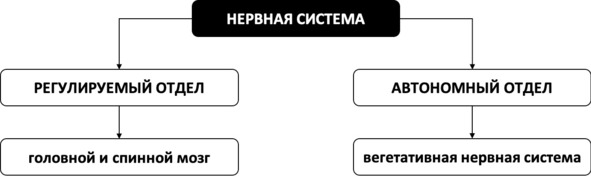 Очень нервная системаЧтобы вступить на путь постепенного преодоления разных проявлений стресса, важно понимать физиологические законы их функционирования. Любые техники и упражнения представляют собой лишь следствие этого понимания и, укрепляя теоретический фундамент, позволяют кирпичик за кирпичиком выстраивать здание счастливой жизни без избыточных стрессовых переживаний. Для начала нам нужно вспомнить о том, что у каждого из нас есть такая прекрасная вещь, как нервная система. «Ну ничего себе прекрасная!» – сразу же воскликнут некоторые читатели. – «У кого-то, может быть, и прекрасная, но моя нервная система давно порвалась на тряпки!» Не торопитесь вешать свою нервную систему на гвоздь или задвигать на антресоли. Она вам ещё пригодится. Но чтобы всякий раз, образно говоря, не рвать её на британский флаг, необходимо понимать, как она всё-таки устроена. Итак, наша всё ещё прекрасная нервная система состоит из двух отделов – регулируемого (он включает в себя головной и спинной мозг и позволяет человеку свободно совершать контролируемые действия) и автономного (этот отдел самостоятельно регулирует работу внутренних органов и секреций и не зависит от желаний человека) (см. рис. 1).