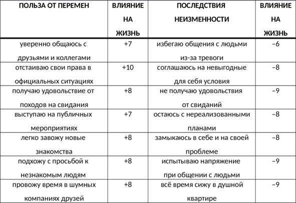 Таблица мотивацииПомимо формулирования цели вам также важно составить таблицу мотивации, в которой вы пропишете конкретные элементы, из которых состоит ваша общая цель. Иными словами, в таблицу мотивации заносятся все предстоящие жизненные перемены, которые оцениваются от 0 до +10 по степени их значимости для вас, а также последствия неизменности, которые оцениваются аналогично, но зеркально: от 0 до —10. Итак, левая часть таблицы будет содержать пользу от перемен, то есть описание того, как вы будете жить после преодоления стресса (изменения важно описывать в прошедшем времени, как будто то, о чём вы пишете, уже осуществилось, словно вы уже так живёте). Правая часть таблицы будет содержать последствия неизменности – описание того, что будет происходить, если вы продолжите оставаться в своей эмоциональной проблеме (см. таб. 1). Такое оценивание послужит вам напоминанием о том, почему же так важно преодолевать свои избыточные негативные эмоции, а ежедневное перечитывание таблицы мотивации поможет вам поверить в себя и эффективность изложенной в этой книге методики, если, порой, вам случится думать: «Не слишком ли велики предпринимаемые усилия?» Прочитывайте цель мотивации и заглядывайте в таблицу мотивации каждое утро. Чистую форму для выписывания цели преодоления стресса и заполнения таблицы мотивации вы найдёте в Приложении 1, расположенном в конце книги.