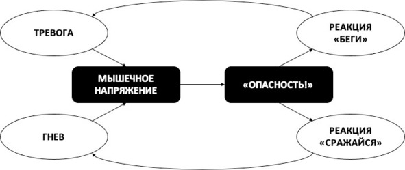 Порочный круг мышечного напряженияЧастые, длительные, интенсивные эмоциональные переживания не могут не сказываться на нашем физическом самочувствии. Так, наиболее стрессовые эмоции – тревога и гнев, являющиеся следствием искажённых мыслей, проявляются в виде мышечного напряжения, которое, в свою очередь, сигнализирует мозгу об опасности и необходимости активации защитных реакций «беги» или «сражайся», обуславливающих усиление, соответственно, тревоги или гнева (см. рис. 4). Этот порочный круг возникает потому, что психика и тело неразрывно связаны между собой. Помимо этого, будучи «воспитанными» и «культурными» людьми, мы подавляем, а не выражаем свои эмоции, в силу чего возникающее мышечное напряжение не расходуется, а накапливается, что приводит к мышечным болям, зажимам, спазмам и симптомам. Тело обмануть невозможно, ведь оно неизменно будет реагировать на избыточные эмоциональные реакции, а если и попытаться его обхитрить, оно обязательно ответит напряжением и симптомами. Важно понимать, что наше тело узнаёт о стрессовых реакциях гораздо раньше, чем вы успеваете осознать, что находитесь во власти той же тревоги или гнева. В этой связи мышечное напряжение довольно часто является индикатором острых или хронических стрессов. Таким образом, если мы научимся замечать это мышечное напряжение и расслабляться на физиологическом уровне, то сможем значительно снизить уровень эмоционального стресса. Помните: вы не можете испытывать выраженной тревоги или сильного гнева, если ваше тело абсолютно расслаблено, ведь где избыточные эмоции – там телесное напряжение, а где телесное напряжение – там избыточные эмоции. Поэтому если вы регулярно и последовательно занимаетесь мышечной релаксацией, автоматически понижающей уровень избыточных негативных эмоций, то в меньшей степени подвержены влиянию стрессовых факторов и гораздо чаще пребываете в спокойном состоянии.