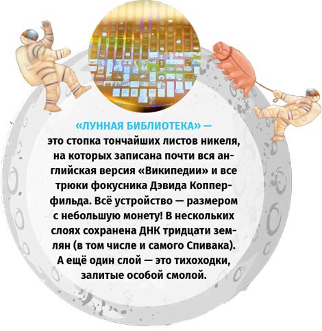 Но 12 апреля 2019 года аппарат разбился при попытке прилуниться. И тут выяснилась удивительная вещь. Одним из грузов этого аппарата была «Лунная библиотека». Её создал бизнесмен и мечтатель Нова Спивак, который считает, что на случай катастрофы нам необходимо сохранить самые важные вещи где-то вне Земли. Его организация называется «Миссия Ковчег» – помните Ковчег из Библии, огромный мифический корабль, на котором сохранилось по паре каждого вида животного после Великого Потопа? Спивак решил создать резервную копию нашей цивилизации. Кстати, если вы делаете что-то очень важное или сложное на компьютере – обязательно сохраняйте эту работу где-то ещё, на флешке или в «облаке», а то пропадёт.