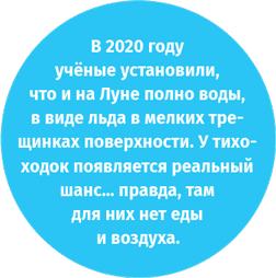 Вообще-то существует международный закон, согласно которому мы договорились никогда не заносить земную жизнь на другие планеты, например на Марс, – чтобы она там не поселилась. На Марсе имеется своя вода и атмосфера, вдруг там есть и своя жизнь и мы так её уничтожим? Но теперь, из-за того что луноход разбился, тихоходки остались на Луне и есть вероятность, что их можно будет размочить и сделать живыми в любое время. Это единственное животное, которое навсегда поселилось в космосе.