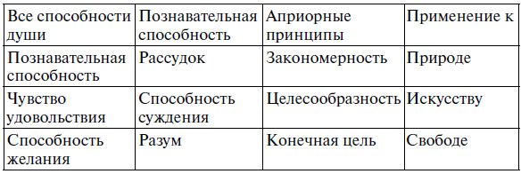 Из способностей души вообще, поскольку они рассматриваются как высшие, т. е. как обладающие автономией, рассудок есть для познавательной способности (теоретического познания природы) то, что содержит априорные конститутивные принципы; для чувства удовольствия и неудовольствия априорные принципы дает способность суждения, независимо от понятий и ощущений, которые относятся к определению желания, и поэтому могли бы быть непосредственно практическими; для способности желания – это разум, который без опосредствования каким-либо удовольствием, откуда бы оно ни происходило, есть практический разум и определяет для способности желания конечную цель, включающую в себя также чистое интеллектуальное благоволение к объекту. Понятие способности суждения о целесообразности природы относится еще к понятиям природы, но только как регулятивный принцип познавательной способности, хотя эстетическое суждение о некоторых предметах (природы или искусства), которые к этому суждению ведут, есть в отношении этого удовольствия или неудовольствия принцип конститутивный. Спонтанность в игре познавательных способностей, в согласованности которых содержится основание этого удовольствия, делает данное понятие пригодным для опосредствования между областью понятия природы и областью понятия свободы в их следствиях; одновременно эта спонтанность способствует восприимчивости души к моральному чувству. Следующая таблица может облегчить обзор всех высших способностей в их систематическом единстве[6]6