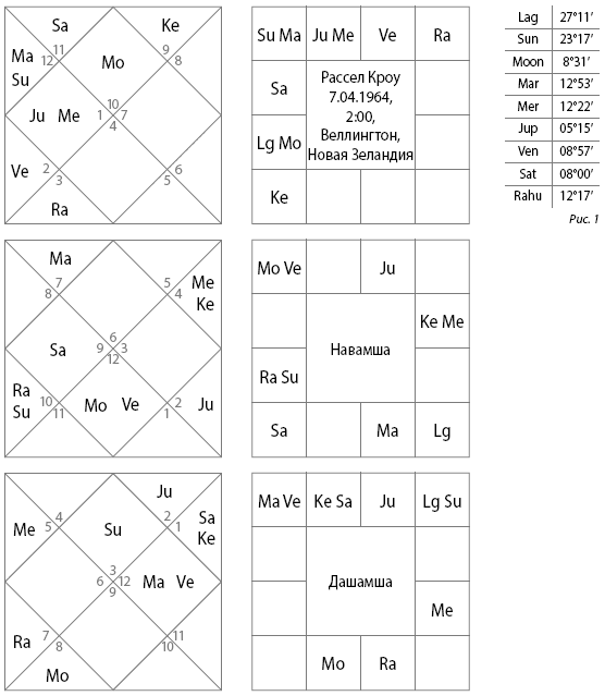 Первым я представлю вам знаменитого харизматичного актера, известного яркими, запоминающимися ролями, – Рассела Кроу. Здесь (см. рис. 1) мы видим его раши в северном и южном стиле. У Рассела Кроу Чандра находится в Абхиджит и в лагне и из этого положения аспектирует собственный 7-й дом. Поэтому актер сегодня популярен и очень успешен. Но его путь был непрост. Будущий знаменитый актер был вынужден оставить школу и зарабатывать себе на жизнь. Он пробовал себя в области музыки, намеревался поступить в институт драматического искусства, ради чего переехал в Австралию – там он работал посудомойщиком и официантом, играл в «Бинго» с пациентами дома престарелых. Одним словом, всячески пытался пробиться в этой жизни, и пробиться именно на телевидение. И только на третий год жизни в Австралии он снялся в четырех сериях популярного там сериала «Соседи» – это был 1988 год.