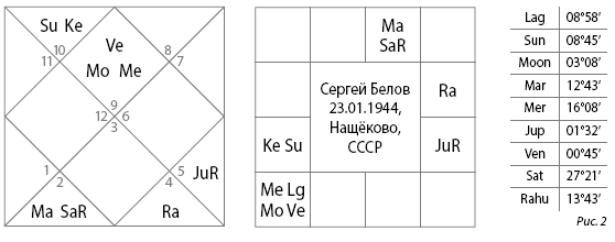 Перед вами чандра-лагна Сергея Белова (см. рис. 2). Напомню, что Сурья в накшатре Абхиджит также обещает пропорциональное сложение, хорошее образование, приятные манеры, склонность к оккультизму, несколько браков и много детей для мужчин, а также власть, землю, авторитет и возможность повлиять на события. Так же говорится, что такой человек будет долго жить. И если стояние Чандры в Абхиджит определяет сознание человека и его внутренний мир, то положение Сурьи в этой накшатре указывает на образ действий человека, на его реализацию в социуме.