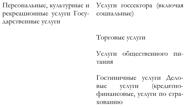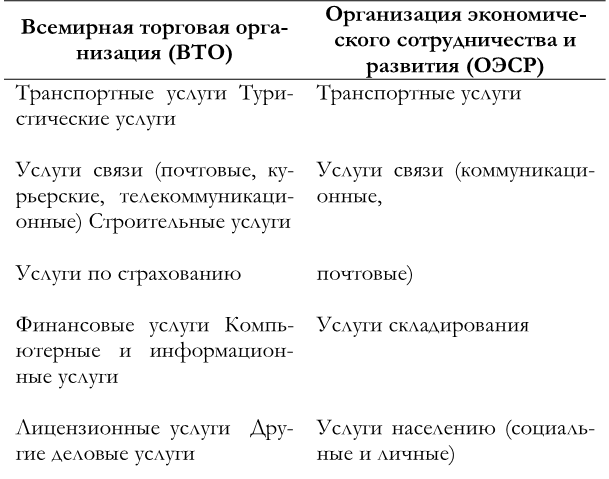 В научной литературе есть несколько вариантов классификации услуг. Наиболее популярна трактовка классификации Всемирной торговой организации (ВТО) и Организации экономического сотрудничества и развития (ОЭСР), проиллюстрированные в нижеследующей Таблице 2 (по работе [32]):