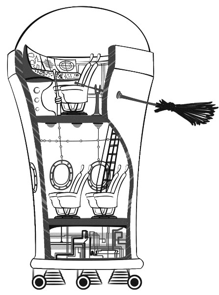 – Внутри. Пест я сделал намного меньше, теперь это просто рычаг на пульте управления. А помело используется, когда ступа поднимается в воздух. Черенок внутри, а метла снаружи. Им можно править, как во́ротом на старом корабле. Прошу! – Яги по небольшому трапу взбежал наверх и откинул стеклянный колпак.