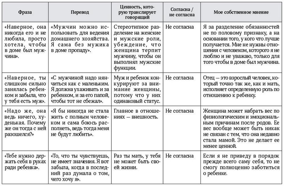 2. Проанализируйте, насколько вам отзываются ценности, которые человек транслирует в обращенной к вам тираде. Если вы не согласны, каково ваше собственное мнение на этот счет? Заполните таблицу по аналогии с примером, приведенным ниже.
