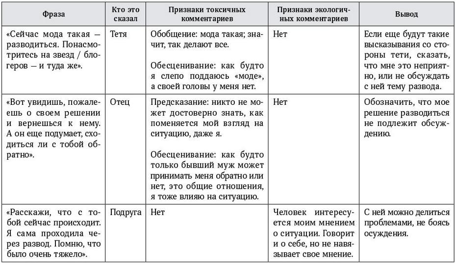 Поймите правильно: обиду, злость и другие чувства у вас могут вызвать даже экологичные замечания. Все вышесказанное совсем не значит, что неприятными будут для вас только слова, нарушающие ваши личные границы. Я ввожу это разделение высказываний на токсичные и экологичные для того, чтобы вы научились распознавать тех людей, которые не готовы поддержать вас в ситуации развода.