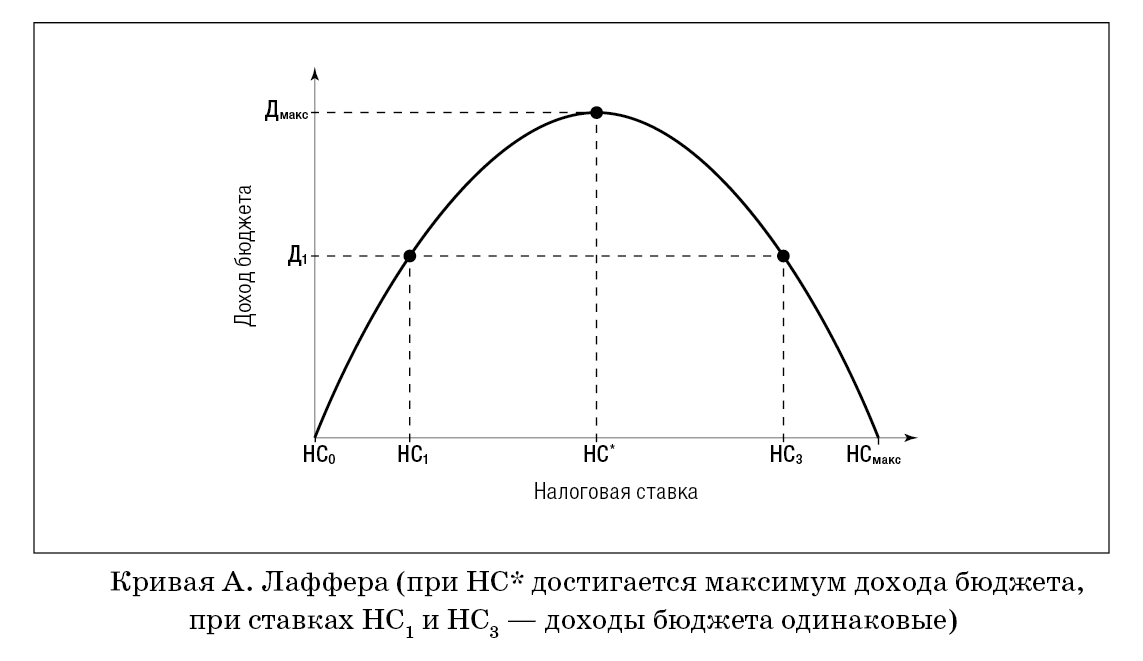 Как видно из графика, при увеличении налоговой ставки растёт и объём налогов, однако после некоторого порогового значения увеличение ставки снижает объём налоговых поступлений.