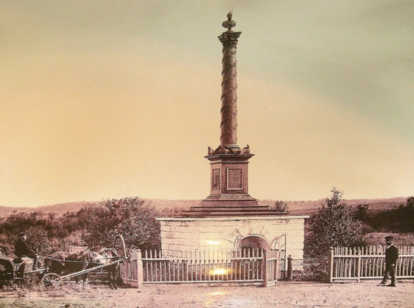 В 1850—51 годах памятник перестроили. Он стал представлять собой украшенную каслинским литьем колонну на пьедестале. Венчал её бюст императора Александра. К пьедесталу крепились чугунные плиты с памятными надписями. Это сооружение не сохранилось до наших дней – новая советская власть памятник разрушила, а колонну было велено утопить в болоте.