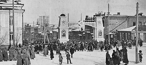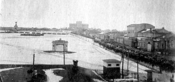 Эта деревянная конструкция была установлена в первые годы после Гражданской войны. Она украшена новой советской символикой. Две колонны, увенчанные пятиконечными звездами и красными стягами, соединялись аркой с серпом и молотом. Арка простояла несколько лет и, скорее всего, в середине 1920-х годов была разобрана.