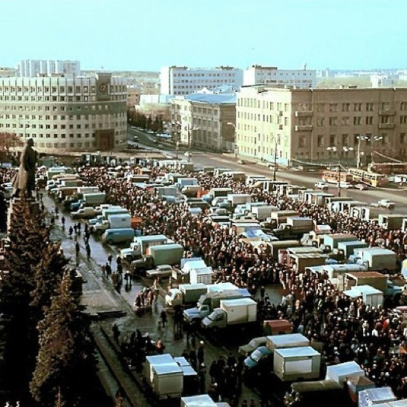 Кстати, в период перестройки и лихие 1990-ые годы площадь Революции будто окунулась на время в своё далёкое прошлое, когда она была базарной площадью, и на ней устраивались ярмарки.