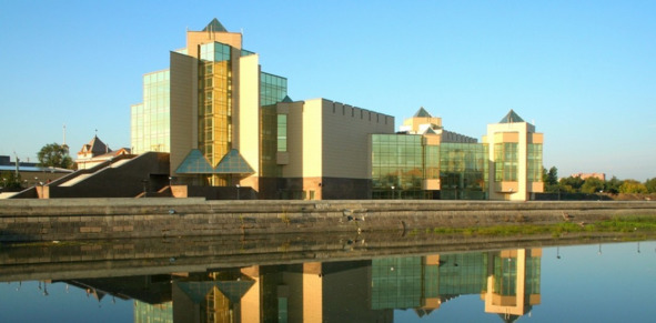 Вдалеке слева на берегу красивое современное здание из стекла и мраморной плитки с конусными крышами – Челябинский областной краеведческий музей. В других городах краеведческий музей размещается в каком-нибудь старом историческом здании. Челябинский музей уникален тем, что это единственное (!) в России здание краеведческого музея, выстроенное в 1990-ых годах, то есть уже в период Российской Федерации.