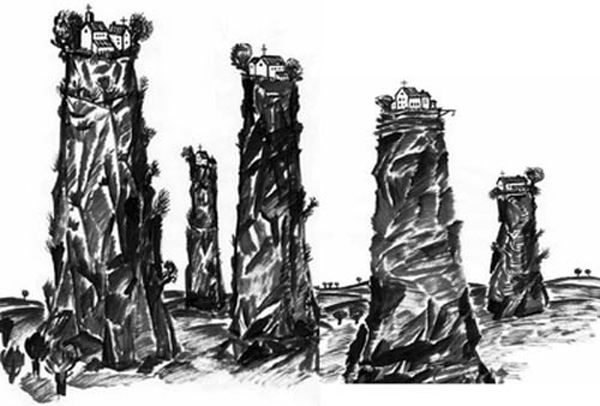 На макушках горных великанов – монастыри и деревья. Представьте: огромные скалы-молчуны, а на самом верху – щепоточка жизни.