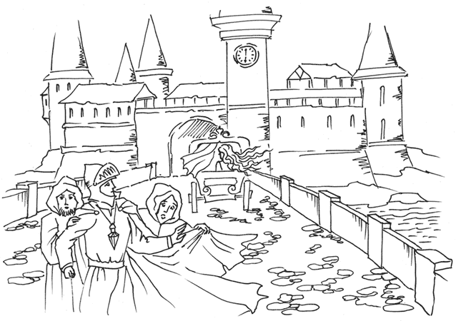 На ратуше старинные часы пробили шесть раз. Рыцарь стоял на мосту… Откуда ни возьмись карета, запряжённая тройкой чудесных гнедых жеребцов. Карета была хороша. Но красавица, выглянувшая из окошка кареты, затмила вокруг всё: и карету, и лошадей, и даже ясное солнышко на небе.