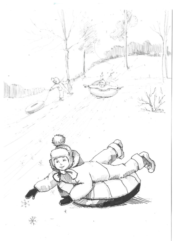 И в этот момент я увидела, что у меня развязался шнурок. Я немножко замешкалась, пытаясь его завязать, смотрю, а мальчик уже мчится по горке прямо на меня. Сейчас мы столкнемся! Я испугалась. Вот он все ближе, ближе, сейчас будет «ба-бах»… Пока он ехал до меня, его скорость постепенно уменьшалась. Ватрушка мальчика слегка толкнула мою, и мы медленно скользнули вперед по ледяной дорожке. Моя ватрушка закатилась в снег, и он оказался такой мягкий, пушистый, совсем не страшный.