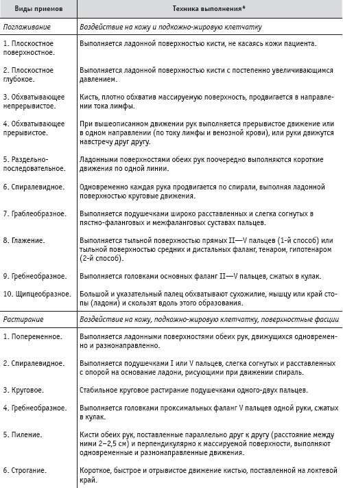 Основные приемы: поглаживание, растирание, разминание, вибрация представлены в табл. 5.1.