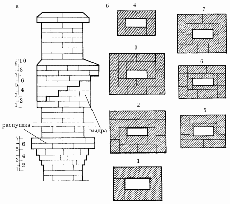 Выдру кладут на стояке с тщательной перевязкой швов. В рассматриваемом варианте кладка состоит из девяти рядов. Каждый ряд выступает за пределы стояка на четверть кирпича. Внутри выдры вставляют кирпичные пластинки такой толщины, чтобы они без изменения сохраняли размеры канала.