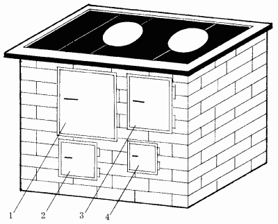 Рис. 94. Кухонная плита с духовым шкафом: 1 – духовой шкаф; 2 – чистка; 3 – топливник; 4 – поддувало.