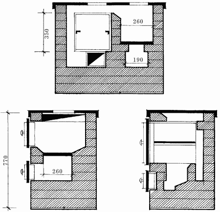 Данная плита (рис. 94) имеет параметры 1020 х 640 х 770 мм (длина, ширина, высота) и рассчитана под чугунный настил (или же пять плит с конфорками) 530 х 900 мм.