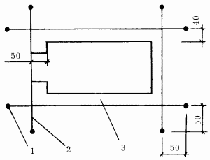 Рис. 116. Устройство фундамента гаража: 1 – колышек; 2 – разбивочный шнур; 3 – фундамент (размеры даны в см).