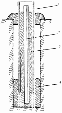Рис. 118. Буровая свая фундамента: 1 – асбестоцементная труба; 2 – арматура; 3 – бетон; 4 – буровая скважина.
