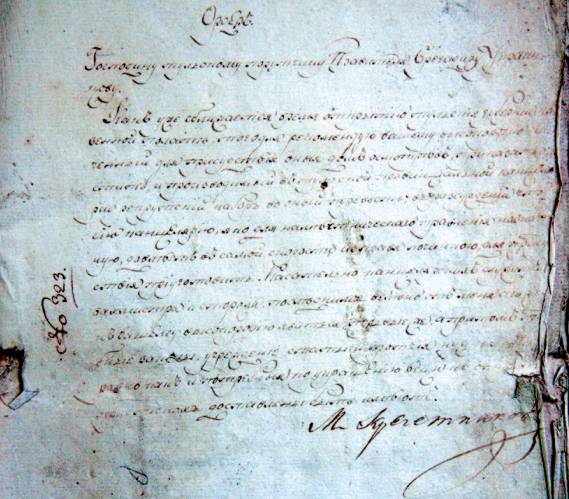 Ордер господину тульскому поручику правителя бригадиру Л. Г. Украинцову за подписью тульского наместника М. Н. Кречетникова о подготовке к работе казенной палаты. Авторская фотокопия. Государственный архив Тульской области (ГАТО). 14 декабря 1777 года: