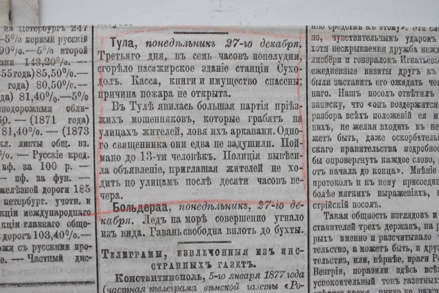В Туле явилась большая партия приезжих мошенников, которые грабят на улицах жителей, ловя их арканами. Одного священника они едва не задушили. Поймано до 13 человек. Полиция вывесила объявление, приглашая жителей не ходить по улицам после десяти часов вечера».